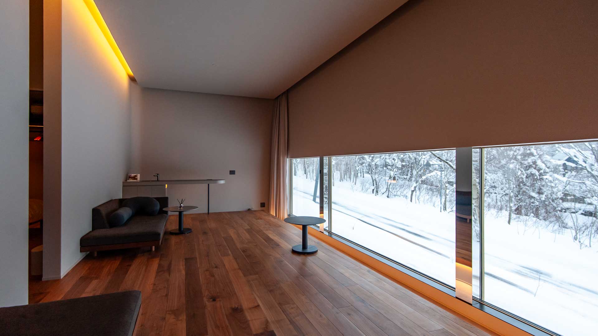 Upstairs is centered on the living area, oriented toward the windows and exterior views, framing the contrast between the interior and the surrounding landscape, with large wall surfaces well suited to a projector setup.